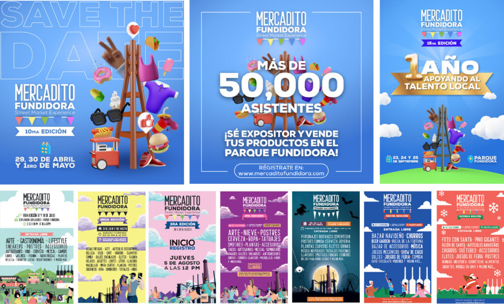 Realizamos el branding completo del Mercadito Fundidora, desde el logo, posters oficiales, ilustraciones 2D y 3D, contenido para redes, material para impresión, sitio web, etc.