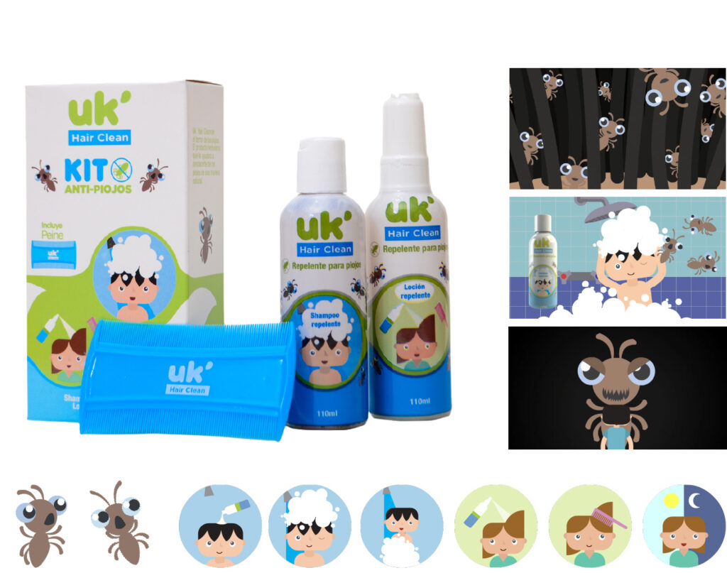 Branding integral para un shampoo anti-piojos. Diseñamos el logo, personajes, envase, embalaje, videos animados, sitio web y material para impresión. Tomando en cuenta las NOMs para exportar a Estados Unidos.