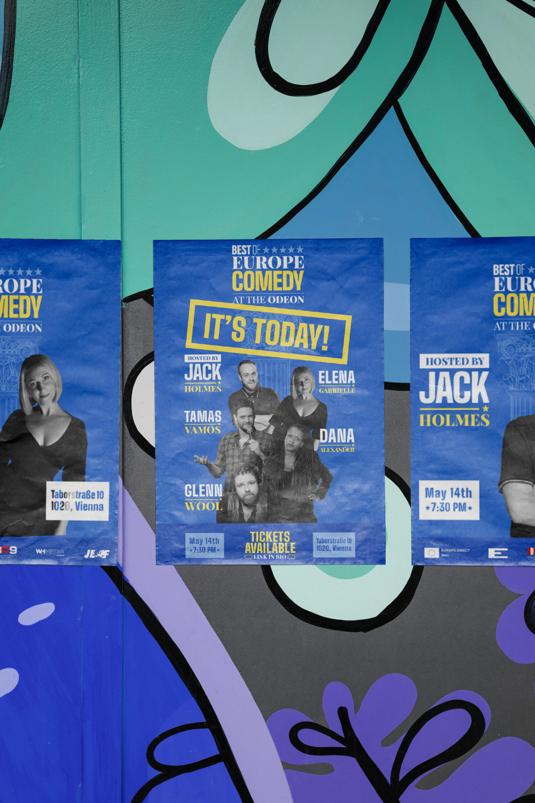 Diseñamos la identidad de un evento de comedia en Austria. El Best of Europe Comedy at the Odeon, fue un evento que requirió el diseño de varios posters y publicaciones anunciando a cada comediante, así como un promocional para televisión local para difundir el evento.